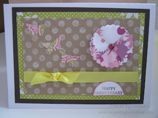 The patterned paper for the green layer and the flower is from Making Memories Just Chillin Girl and the butterflies paper is from K and Co Amy Butler Belle paper. The sentiment Stamp is from Hero Arts Sentiments.