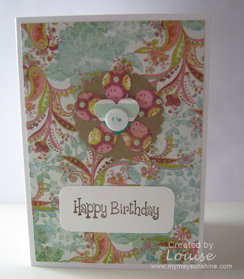 The papers for this card are from Basic Grey’s Lemonade collection apart from the heart which is from Making Memories Just Chillin’ Girl Collection and the stamp is from the set as the first card, Papermania’s Clare Curd stamps. I used an 2″ scallop circle punch, 1″ and 2″ flower punch from EK Success.
