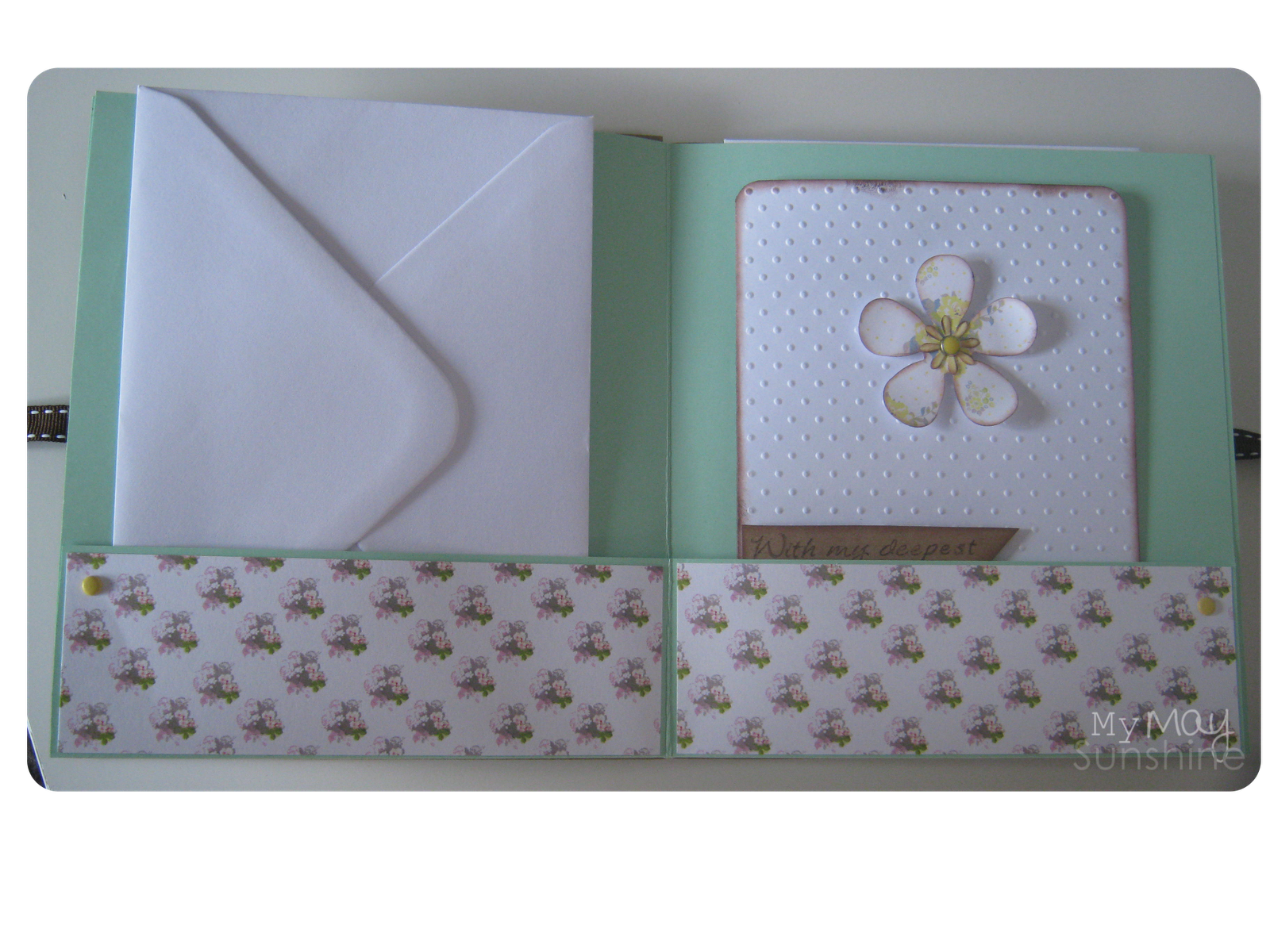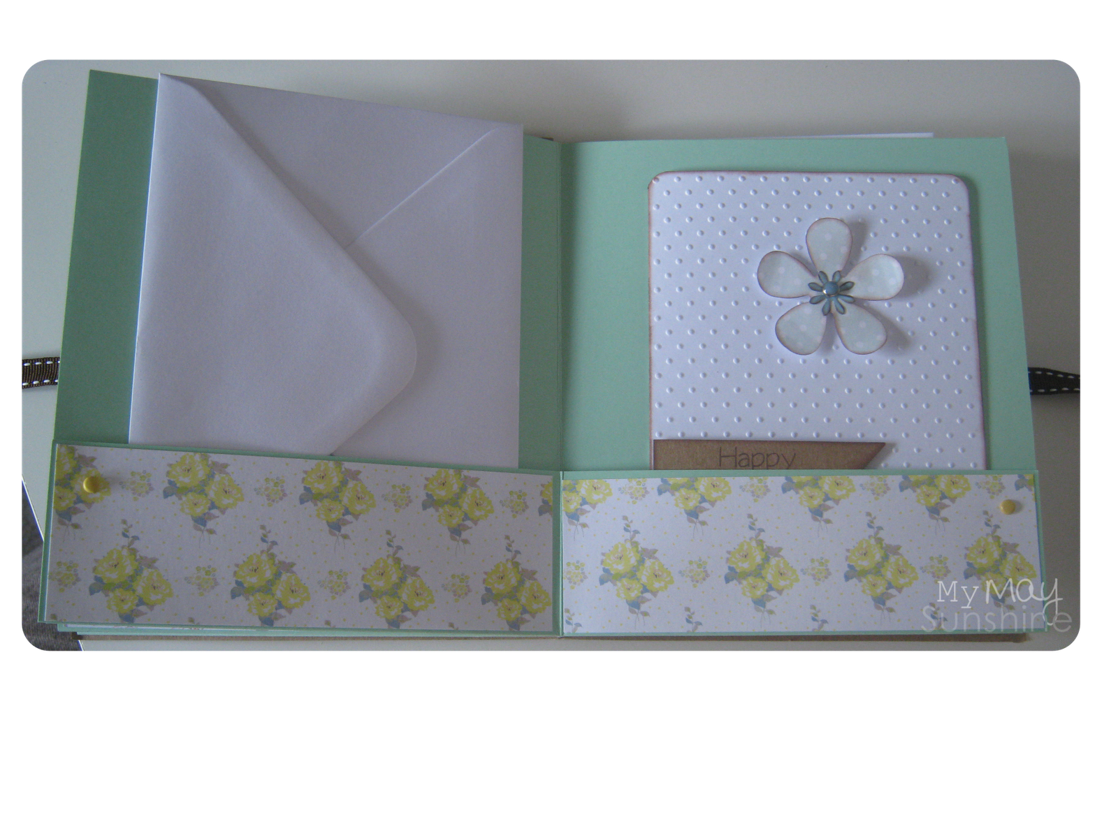 On the inside of the book I covered the lower flap, on each page, with patterned paper and secured the sides with a brad so it is easy to slip in the card and envelope.