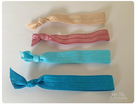 I decided to make some elasticated hair ties with some elastic cut down to 10 inches, tied them and then added some glossy accents glue to stop them fraying. They are great in the hair as they don’t snag the hair but also look pretty on the wrist.