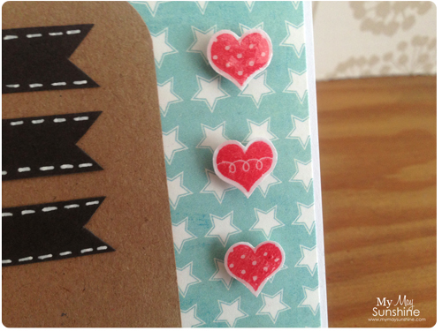 I added some glossy accents on the hearts to add some dimension and added some faux stitching to the banner shapes using a white gel pen.
