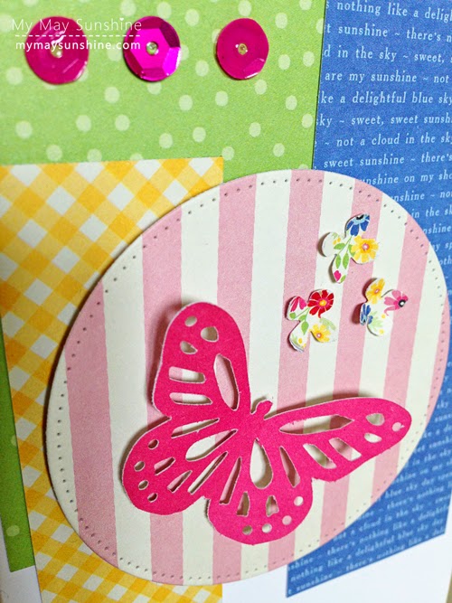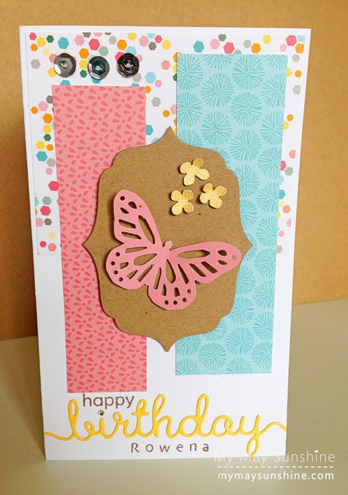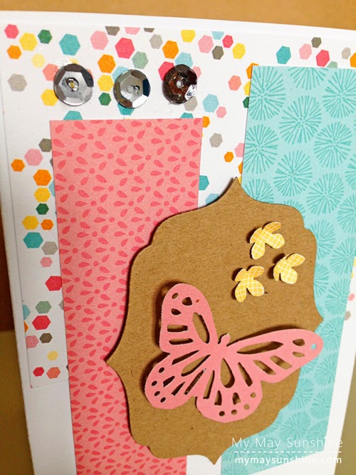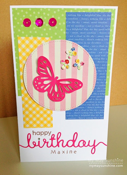 I went with the Martha Stewart Monarch large butterfly punch and the hydrangea punch on the circle and added some sequins to the top of the card.