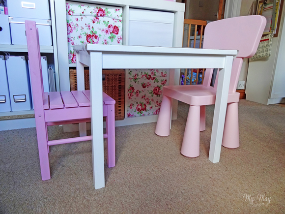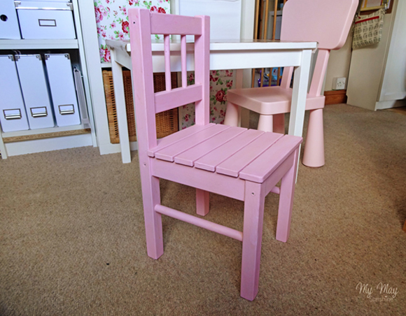 I thought it would be good to try and match the paint for the wooden chair to the colour of the plastic chair but that was difficult without taking the chair to the shop! So I went with a pink Candy Cane matt paint from Wilkinsons and then used the same varnish I used on the table. I just bought a tested pot for the chair and it was just enough.