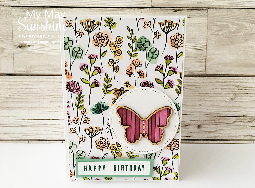 I decided to use the Share What You Love designer series paper for the background and for the main image. I used the wooden butterfly elements along with some of the patterned paper for the main image and added it to a stitched circle. I added some of the Share What You Love pearls to the centre of the butterfly.