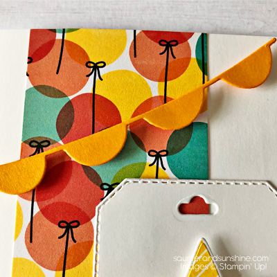 Also from the die set, I used one of the banner dies, cut it from mango melody card stock and added it to the top of the card on dimensionals so it could be seen more over the balloon paper.